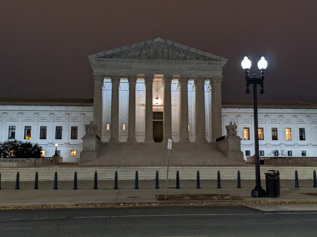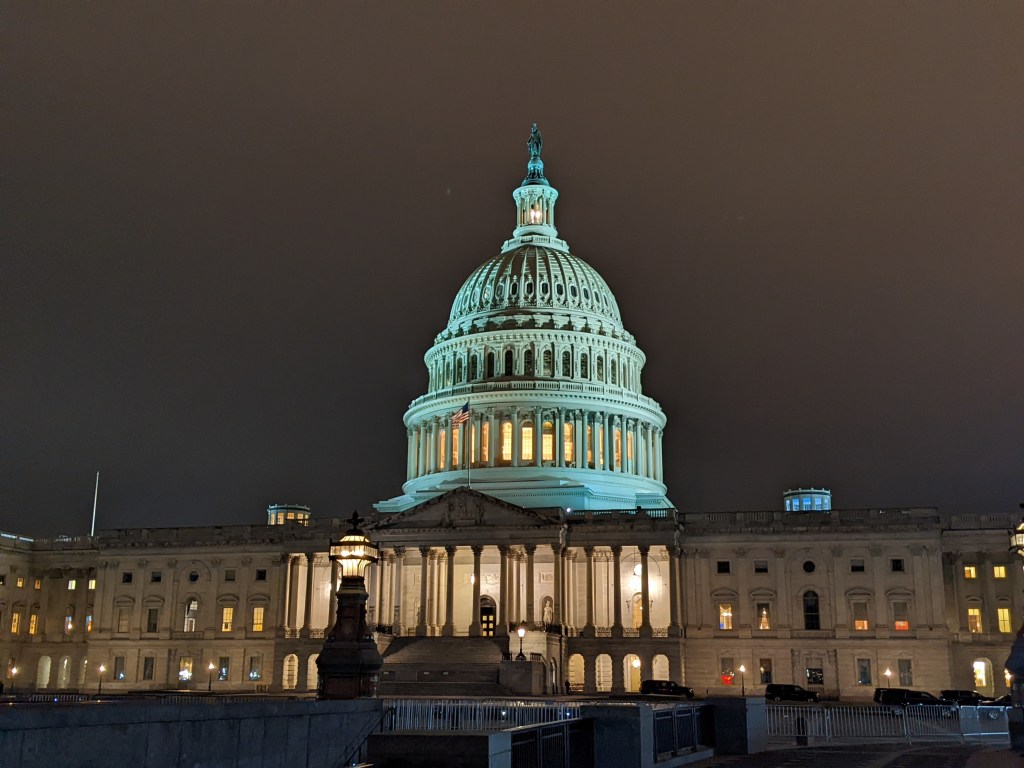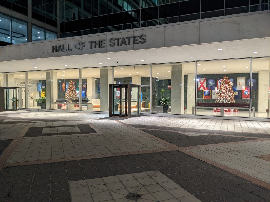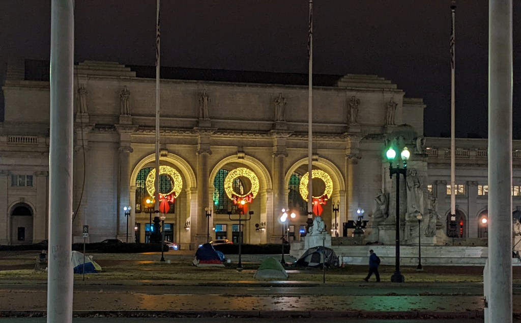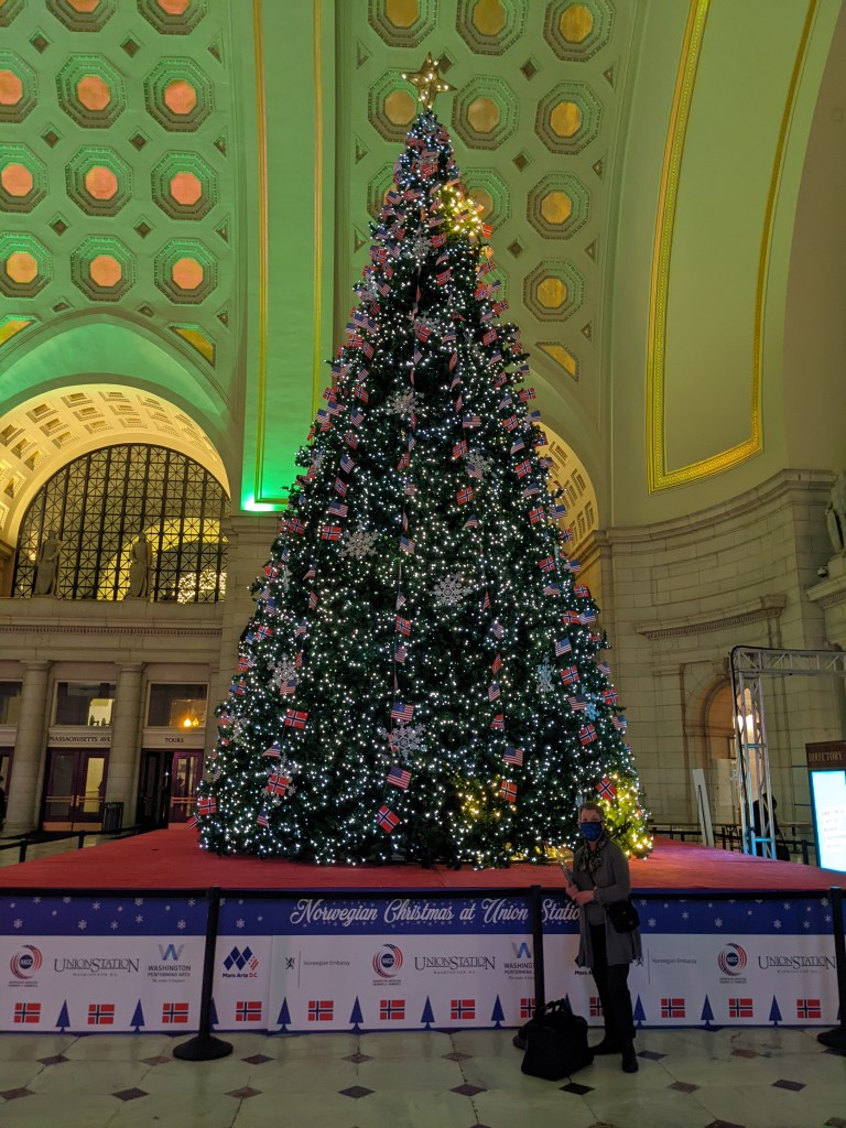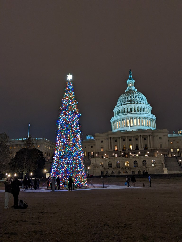 We finally pulled into D.C. around 5:15 p.m. and the train to Chicago had left over an hour before. We finally found the customer service desk and they were much more accommodating than we had been led to believe they would. The guy at the desk immediately took us to the snazzy first-class lounge (turns out that you get to hang out there anyway when you have a sleeper ticket) while he fixed us up with a room for the night and changed our reservation for the Chicago-bound train. It took about an hour, but we got all fixed up. The woman at the desk in the lounge, Alexis, even helped us get in touch with the customer service for our Amtrak vacation package to have them get in touch with our Chicago hotel to let them know we’d be checking in a day late. She also made the wonderful suggestion to go check in at our hotel and then walk around the Capitol and National Mall to see the National Christmas tree and other lights. So we did.