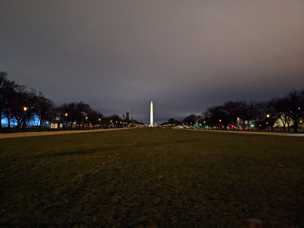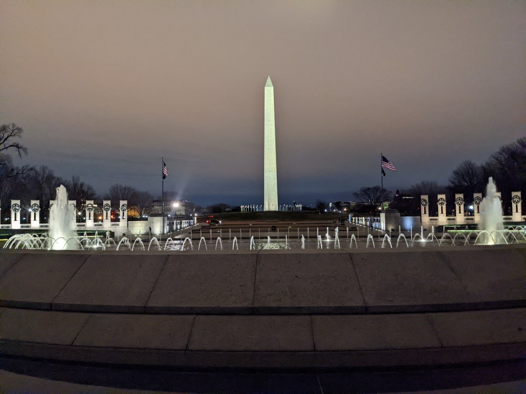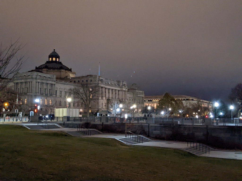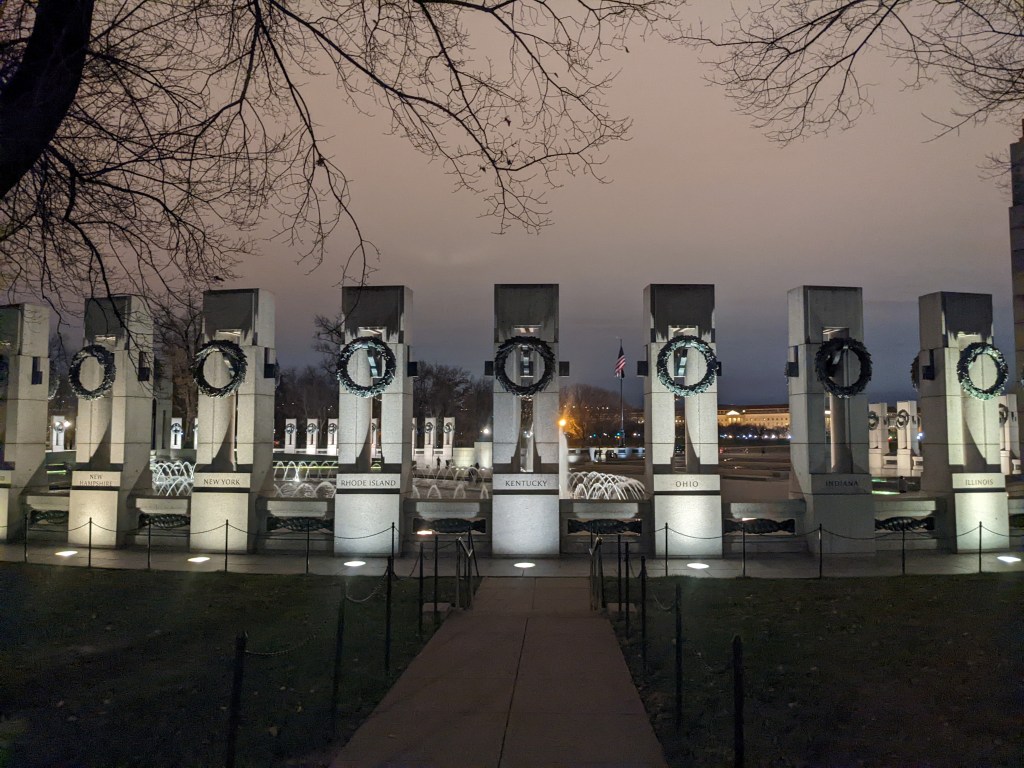 The White House had three lit wreaths hanging between the main columns and lit trees in front (back?) and we got close enough to see some of them. At that point we’d walked a “fur piece” and it was getting close to 10 p.m. so we decided to head back to the hotel, up the other side of the Mall. As we hadn’t expected to be walking nearly that much (and had left our big suitcase at the station in anticipation of rechecking it before leaving Saturday), Mom had on her rainboots instead of a better walking shoe. Her pinky toe ended up a bit raw from her sock seam rubbing it. By the time we got back to the hotel we were both about ready to collapse.