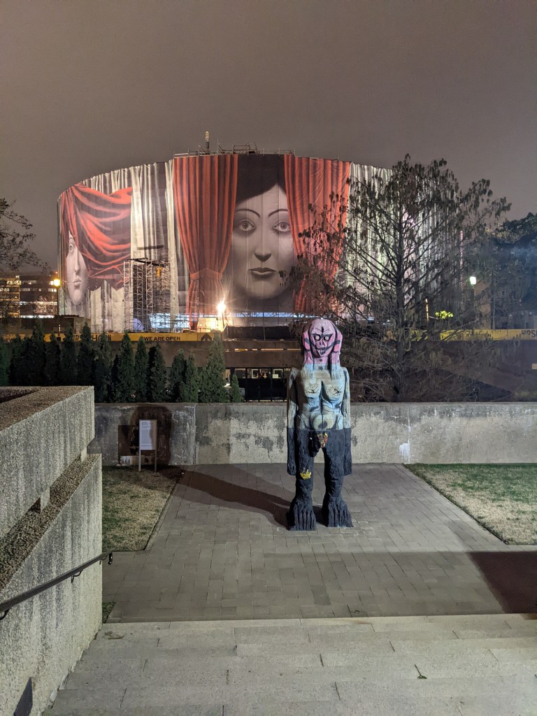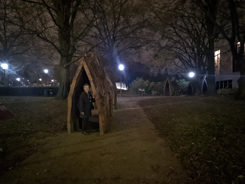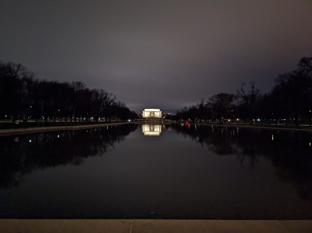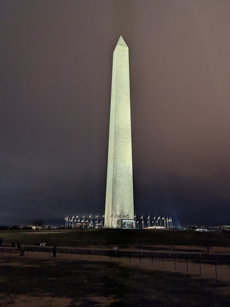 The White House had three lit wreaths hanging between the main columns and lit trees in front (back?) and we got close enough to see some of them. At that point we’d walked a “fur piece” and it was getting close to 10 p.m. so we decided to head back to the hotel, up the other side of the Mall. As we hadn’t expected to be walking nearly that much (and had left our big suitcase at the station in anticipation of rechecking it before leaving Saturday), Mom had on her rainboots instead of a better walking shoe. Her pinky toe ended up a bit raw from her sock seam rubbing it. By the time we got back to the hotel we were both about ready to collapse.