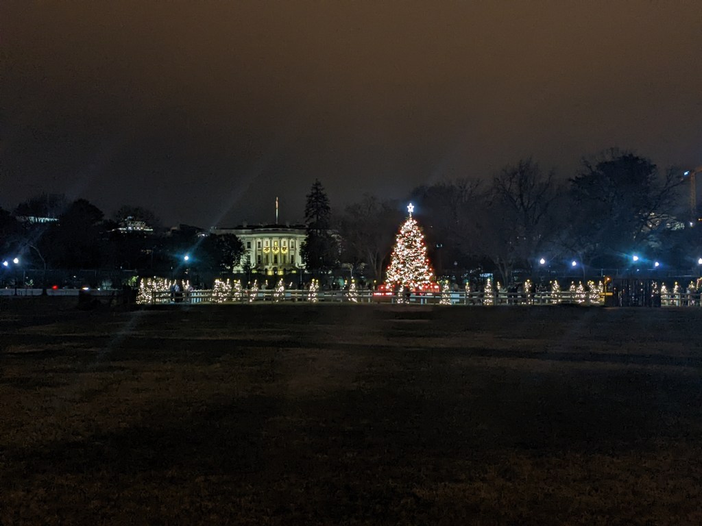 We walked around to the back of the Capitol and saw the National Christmas Tree, then walked for a few minutes in the botanical garden. We decided to walk down the Mall to the Washington Monument and then see if we felt like going any further. We passed a Smithsonian museum for every day of the month it seemed. There were other people around, but not a crowd by any means. There were more people around the Washington Monument, and we went to the Reflecting Pool and around the WWII Memorial, before deciding to go over to the White House and see what was happening over there.