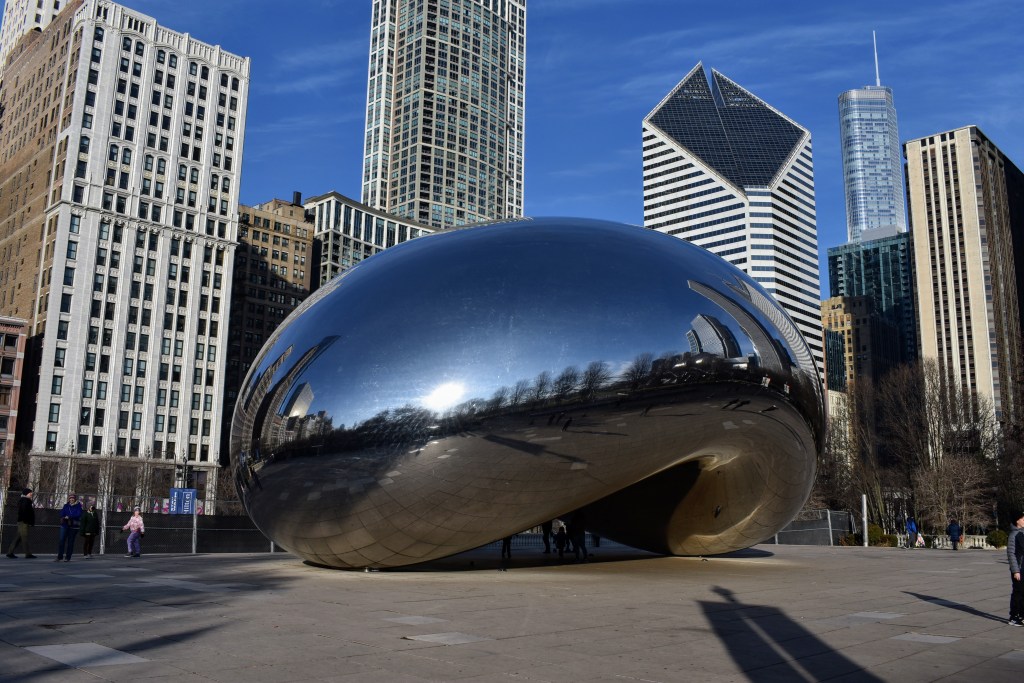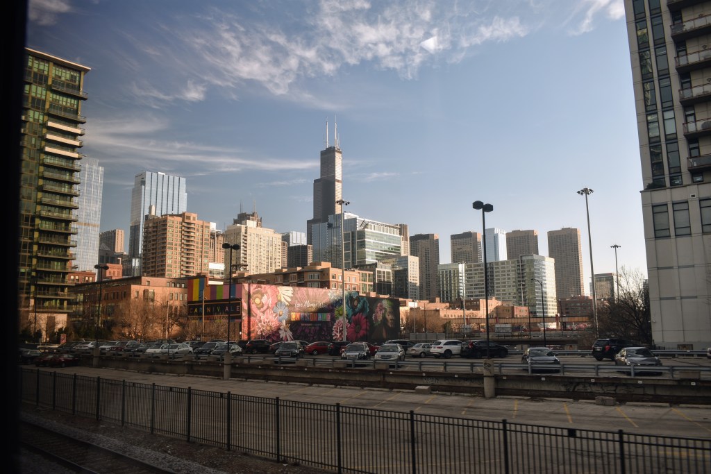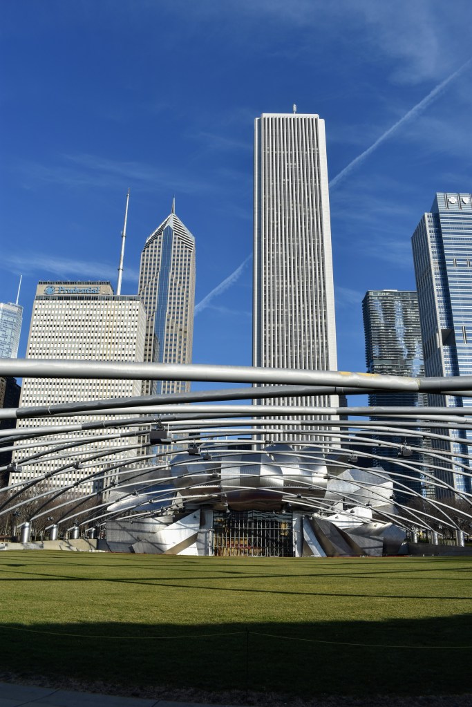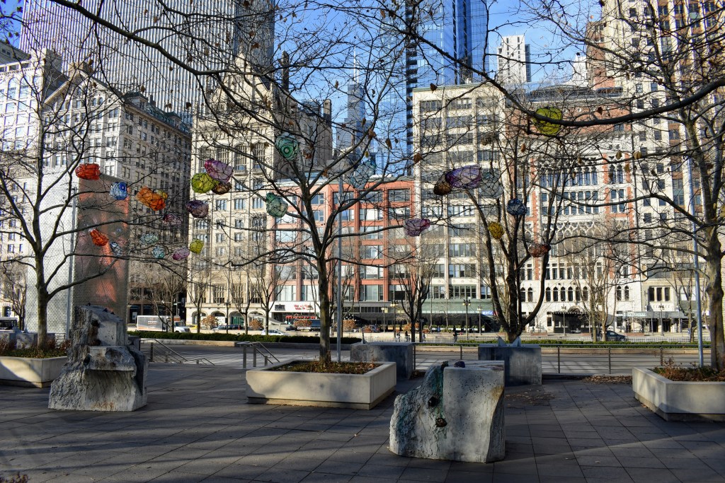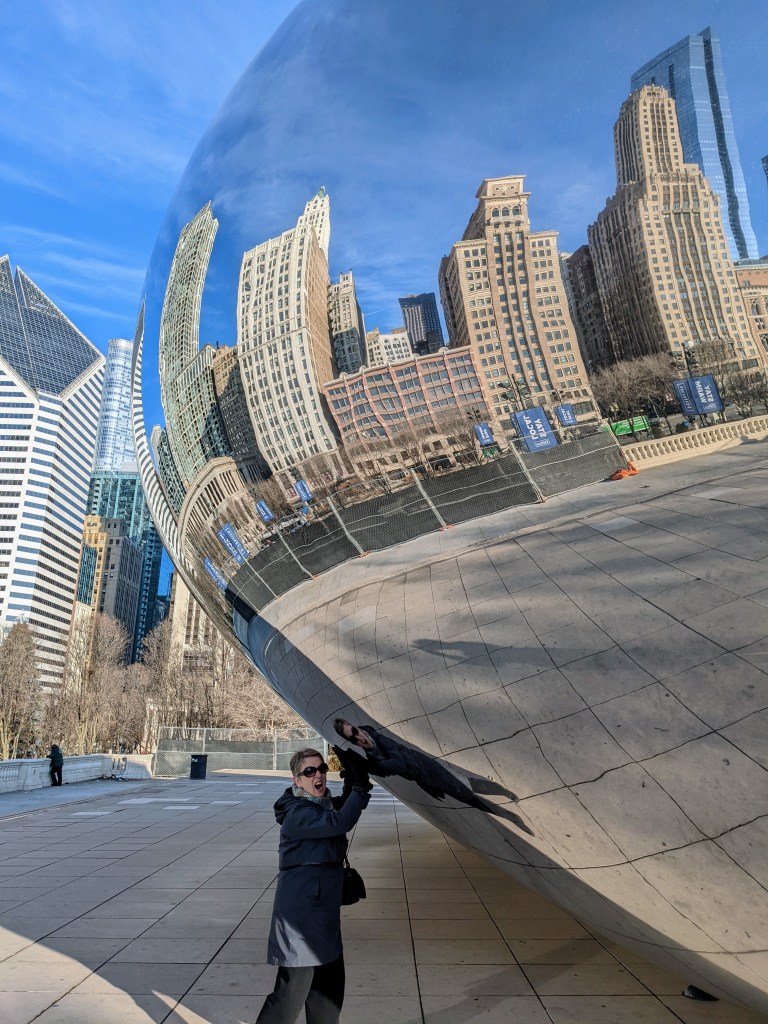 Since the train to Seattle wouldn’t leave until about 4 p.m., we decided to leave our bags with the bell desk again, get some breakfast, and wander for a few hours before heading to the train station. We ended up at the Corner Bakery, using that coupon, before heading to Millennium Park. We wandered around there, made the requisite stop at The Bean (“Cloud Gate” for any purists, though I think Anish Kapoor deserves all the annoyance he gets from people calling it The Bean), and walked over the BP Bridge. The park and bridge were still frosty in some spots that remained in shadow. From there we walked down Washington to see Picasso’s untitled sculpture. It was in the middle of a Christmas market, but the market didn’t open until 11, so we kind of poked around the outside of the barrier to try and see the sculpture from different sides. We finished our self-guided tour with a walk over to Calder’s Flamingo, which was not in the middle of a Christmas market.