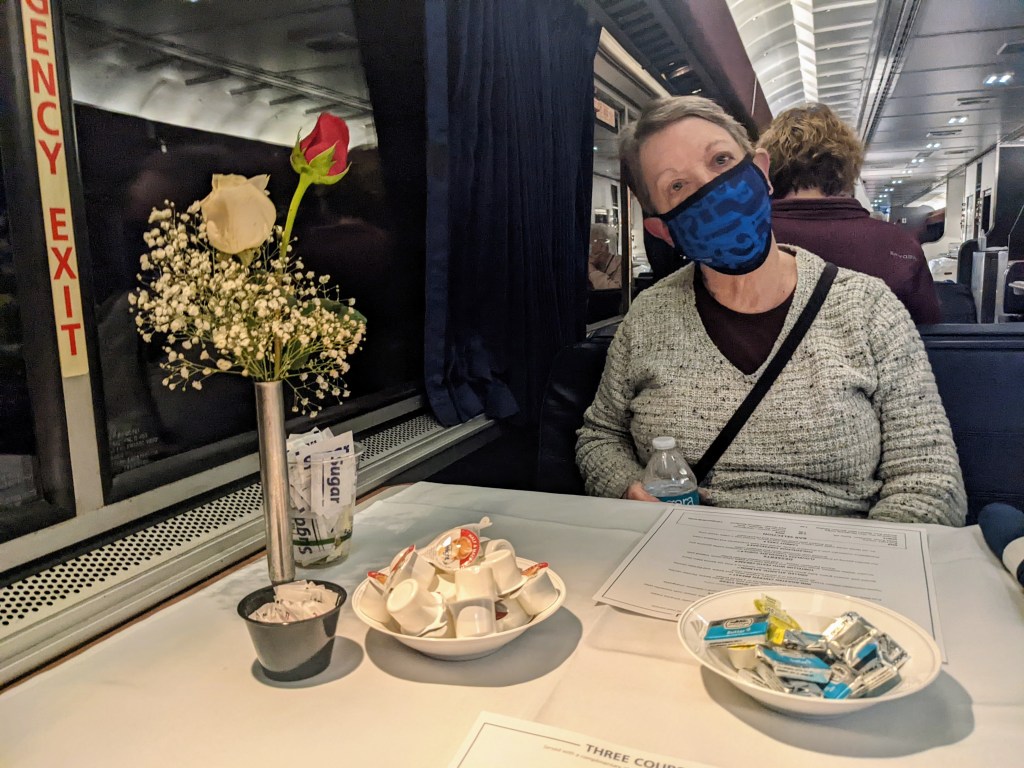 We got all checked in and this time we were in a Superliner roomette on the second story of the train. It was very similar to the roomette we had on the very first leg of the trip except with no toilet, no sink, and no window for the top bunk. This also meant a bit less room for any carry-ons. The guy in the roomette across the hall from us, Gary, was very friendly and outgoing, so I was glad Mom was there as I’m pants at keeping up a conversation. We talked to him for a bit before closing our door—the rule on the train is that you have to have your mask on at all times unless you are actively eating or drinking or if you’re in a sleeper room with the door closed.