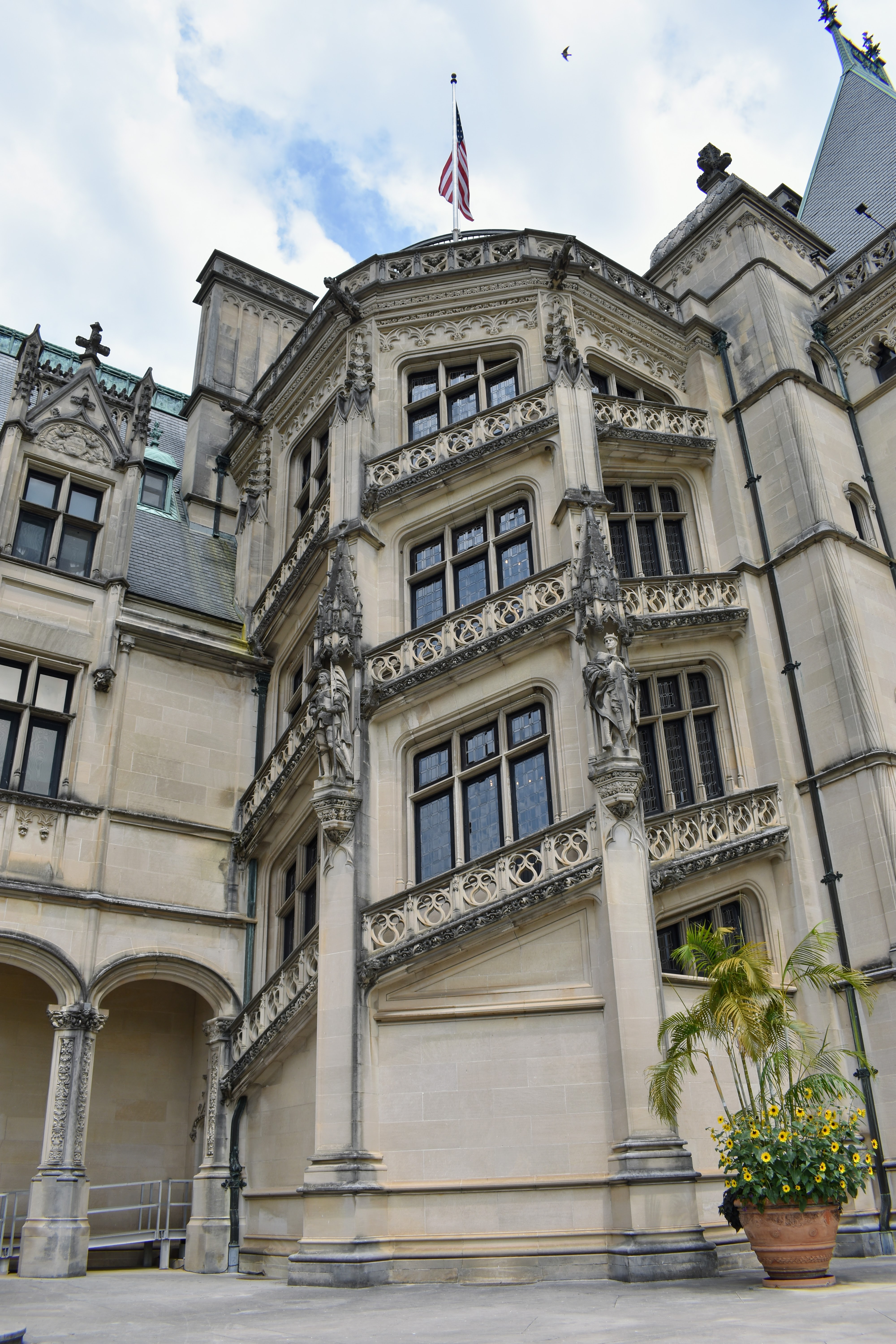Of course, we wanted to stop at the different signs and read about the various stages of planning and constructing the grounds around Biltmore. Frederick Law Olmsted, Biltmore owner George Vanderbilt II, and architect Richard Morris Hunt apparently all worked quite well together and exchanged many ideas about the entire estate. One of the things I found most interesting about the grounds was that when construction started, the land was basically fallow farmland. Frederick Law Olmsted had the idea of constructing the grounds to have a wild feeling that would then contrast and complement the French chateau-style house and manicured gardens. It does have a magnificent effect when you drive through several miles of huge trees, large bushes, and blooming flowers, listening to birds singing, and then through the secondary gates at the house itself.
