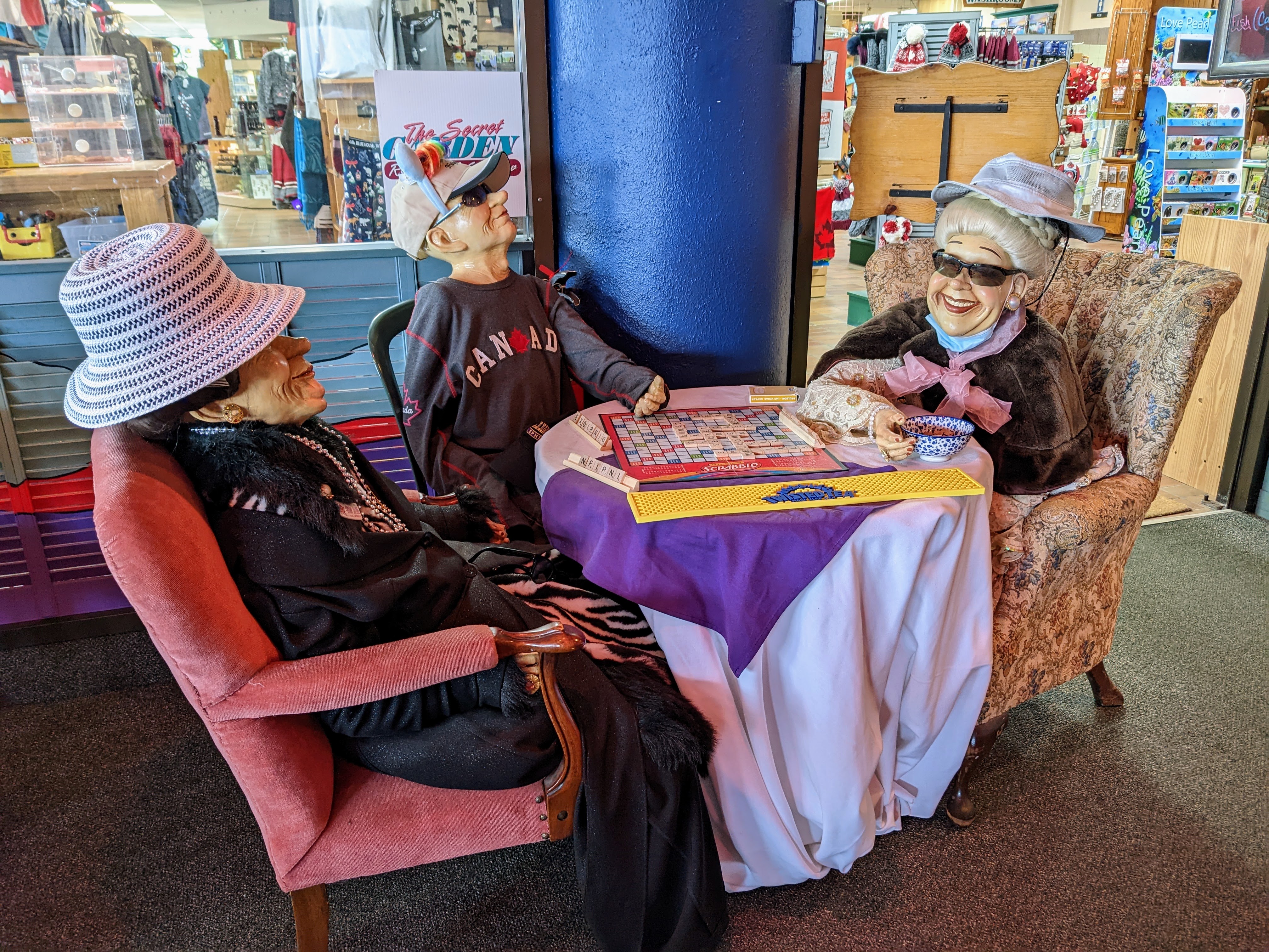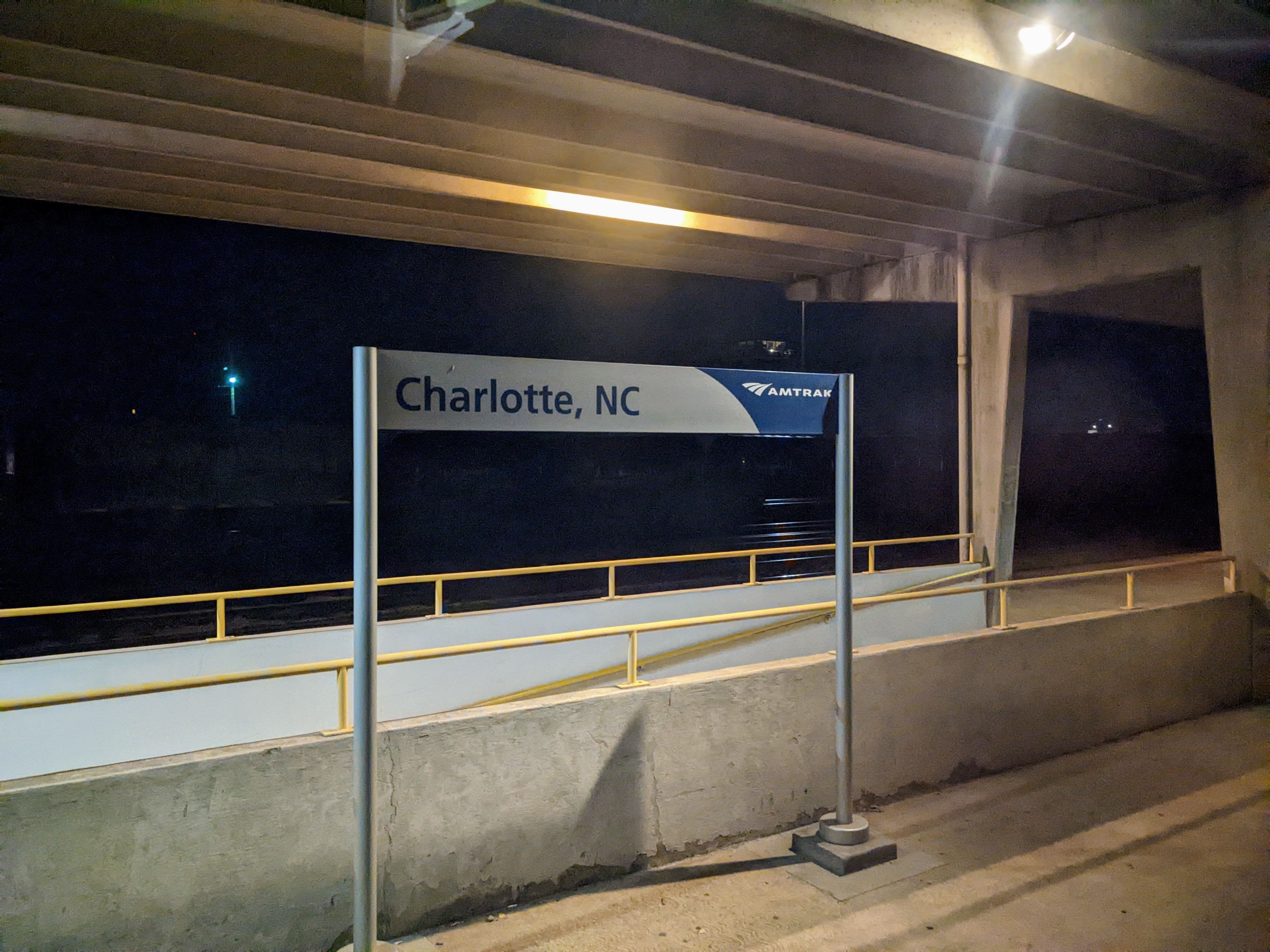 Finally, we got down to our car and we were with Martha again! We were so happy to see her! Settled in our roomette, we passed the rest of the trip pretty much the same way: watching the scenery, doing word puzzles, and resting. The train was running ahead of time, so we arrived in Charlotte at about 2:30. In the morning. Apparently, they weren’t quite ready for us and the door from the platform into the station was locked. I was surprised at how many other people were out there with us, coming off the train. We didn’t have to wait long—just until the baggage person drove up with all the luggage.