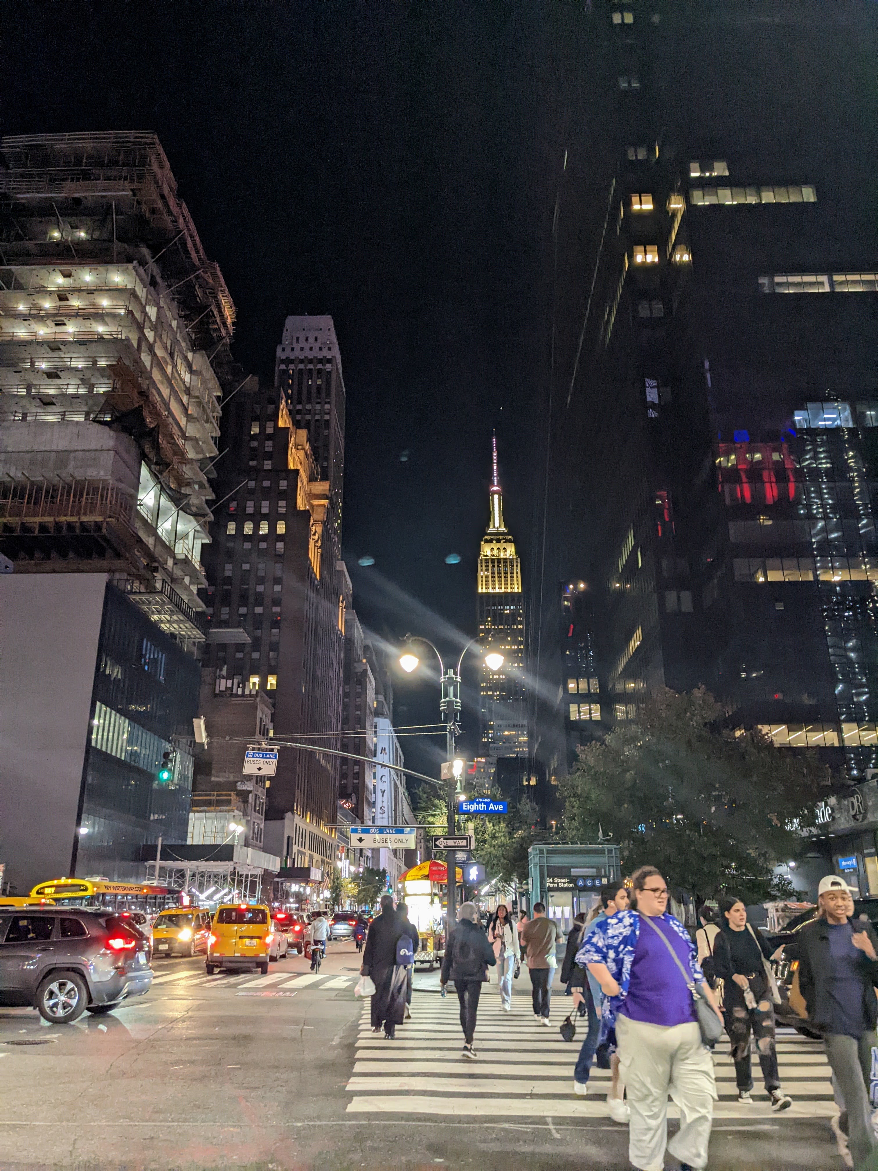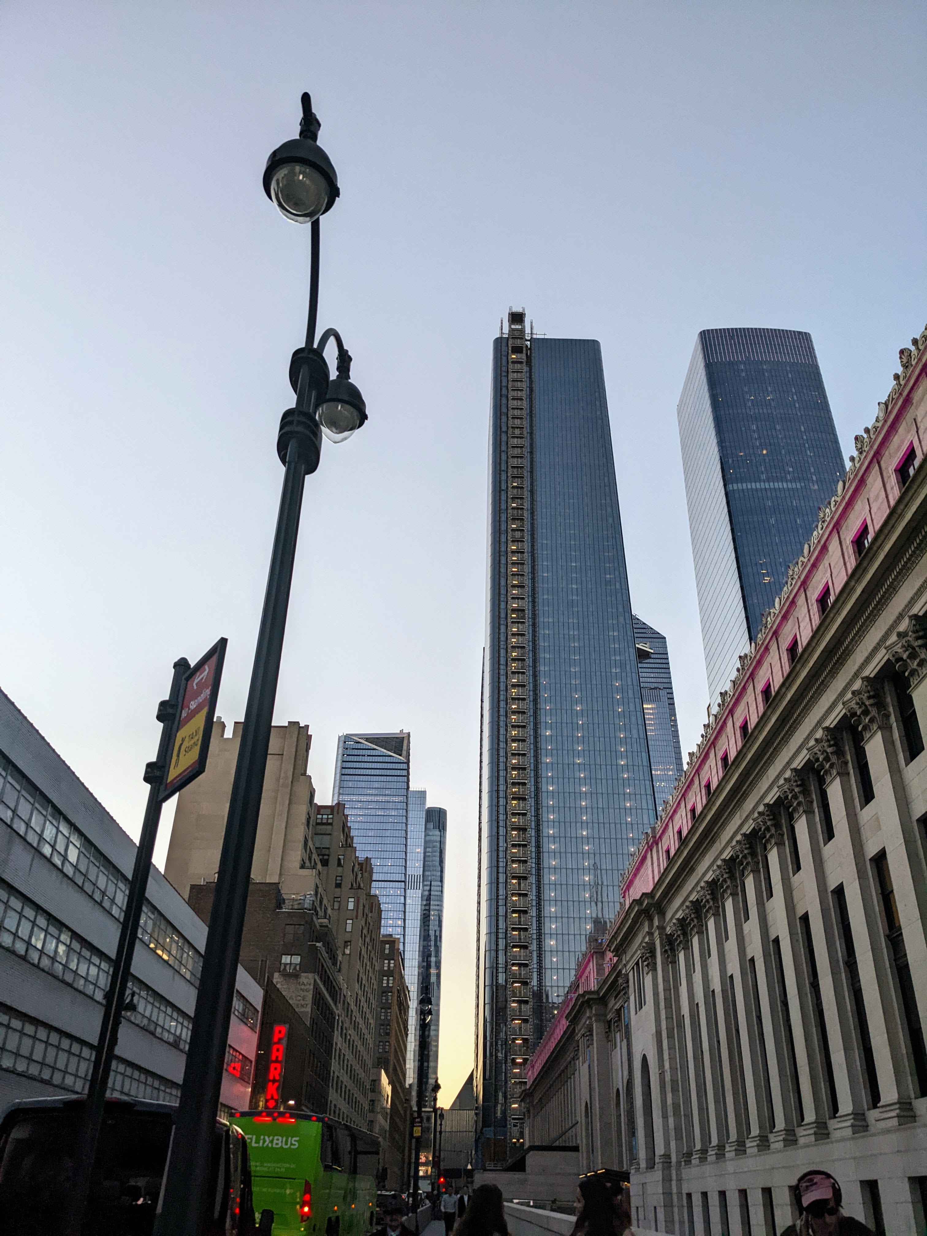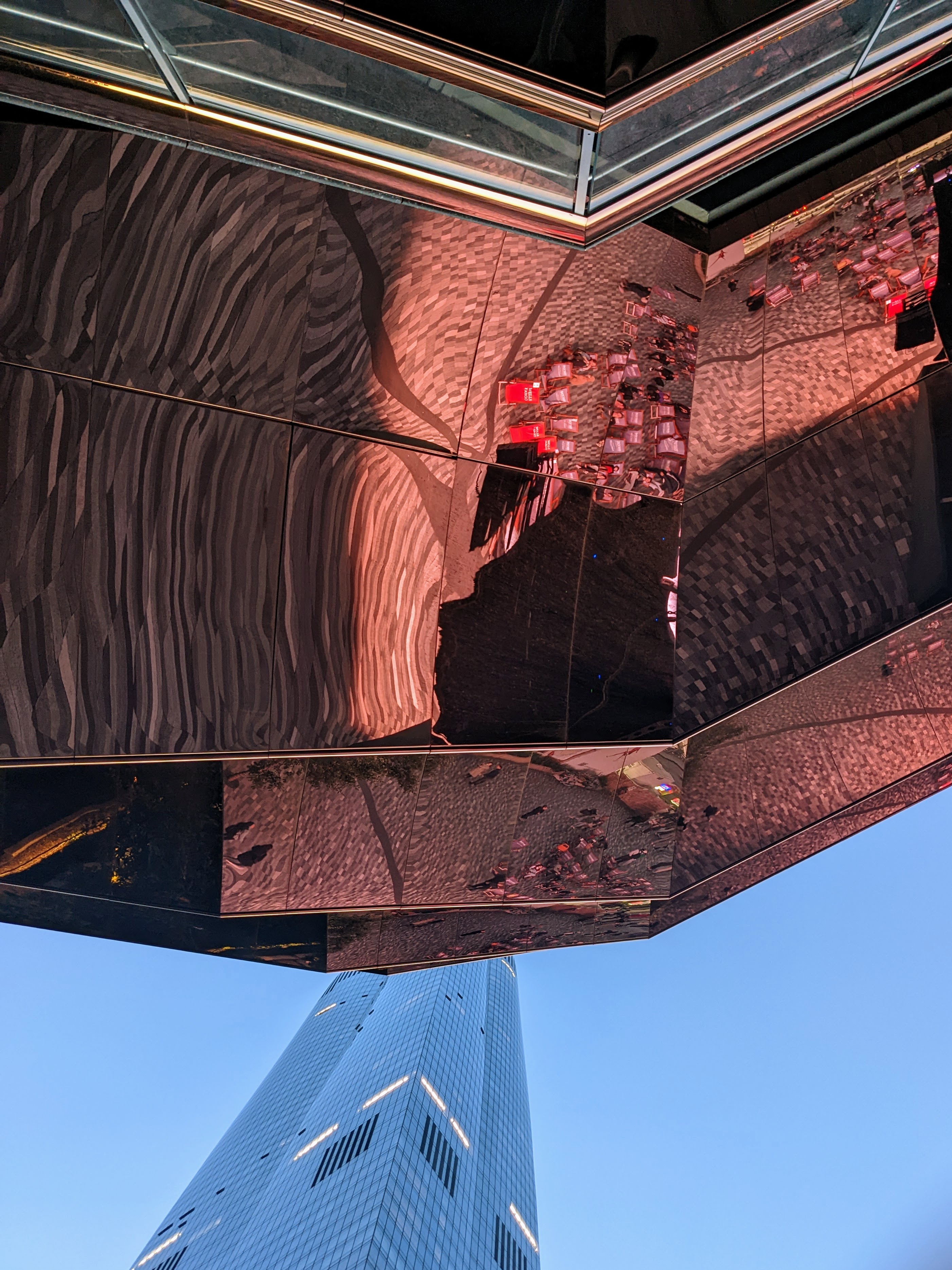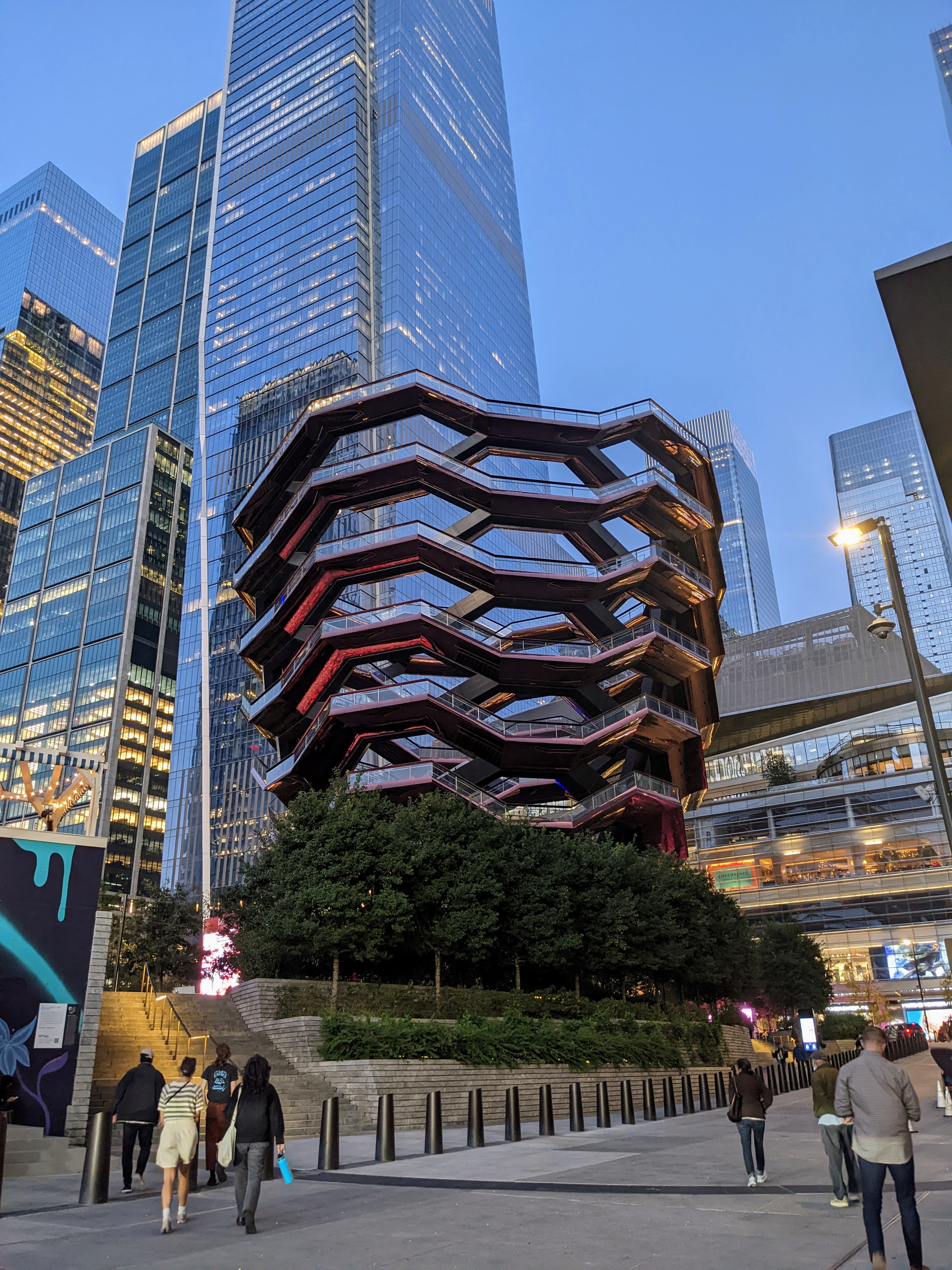 We got into the Big Apple at 5:40 or so and made our way up to the Moynihan Train Hall. After spending all day on the train and eating so much, we asked at the Amtrak Metropolitan Lounge if we could leave our bags while we took a walk and come back for them. And even though our journey was over, since we’d had the roomette in the sleeper car, we were able to do that! So we put our bags in a couple of lockers and walked over to the Vessel.